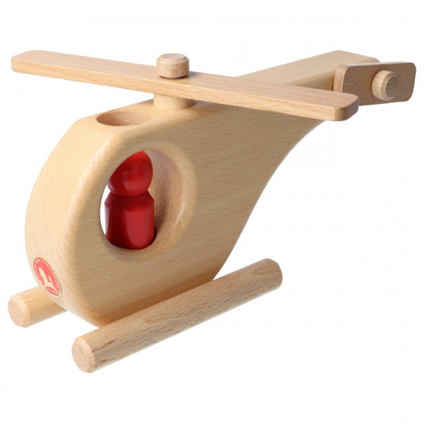 Der tolle Hubschrauber, handgestaltet nach Konrad Keller, hat zwei drehbare Rotorenblätter. Dazu ist das Männchen ist oben aus dem Hubschrauber herausnehmbar.